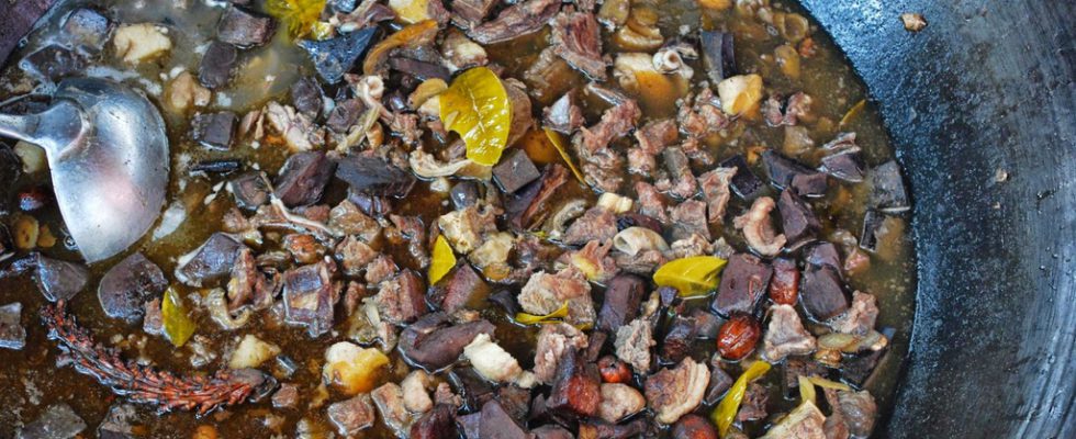 Thắng cố là cái tên rất gần gũi được không ít người nói tới khi ghé Tây Bắc. Đây là món ăn thường được nấu và chế biến bởi người dân bản làng trong các lễ hội, chợ phiên đông người. Nguyên liệu chủ yếu của món ăn "khó nuốt" là nội tạng ngựa gồm các loại tim, gan, tiết, lòng, thịt… kết hợp cùng nhiều loại gia vị đặc trưng như quế chi, sả, thảo quả, lá chanh, gừng… và cây thắng cố. Ảnh: Cooky.